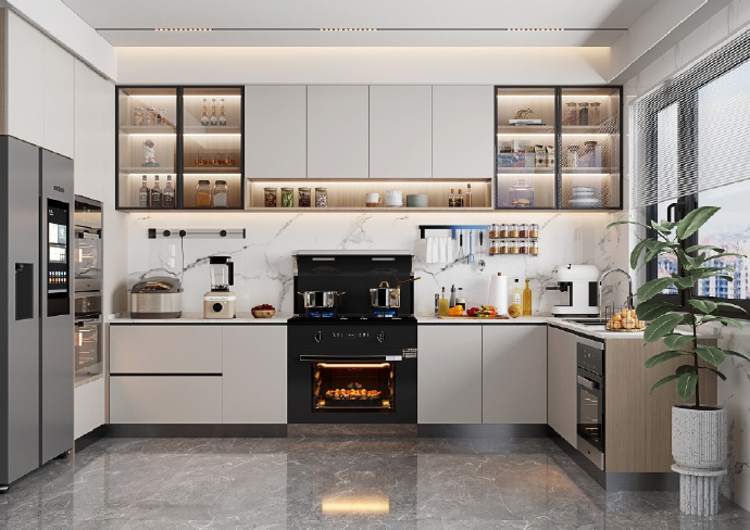 2.廚具的安裝要求專業(yè)人員進行測量、設計、確保制作的尺寸正確。廚具及吊柜(廚具下有調(diào)整腳)水平。燃具和臺面接縫處用硅膠作防水處理,以防積水滲漏。